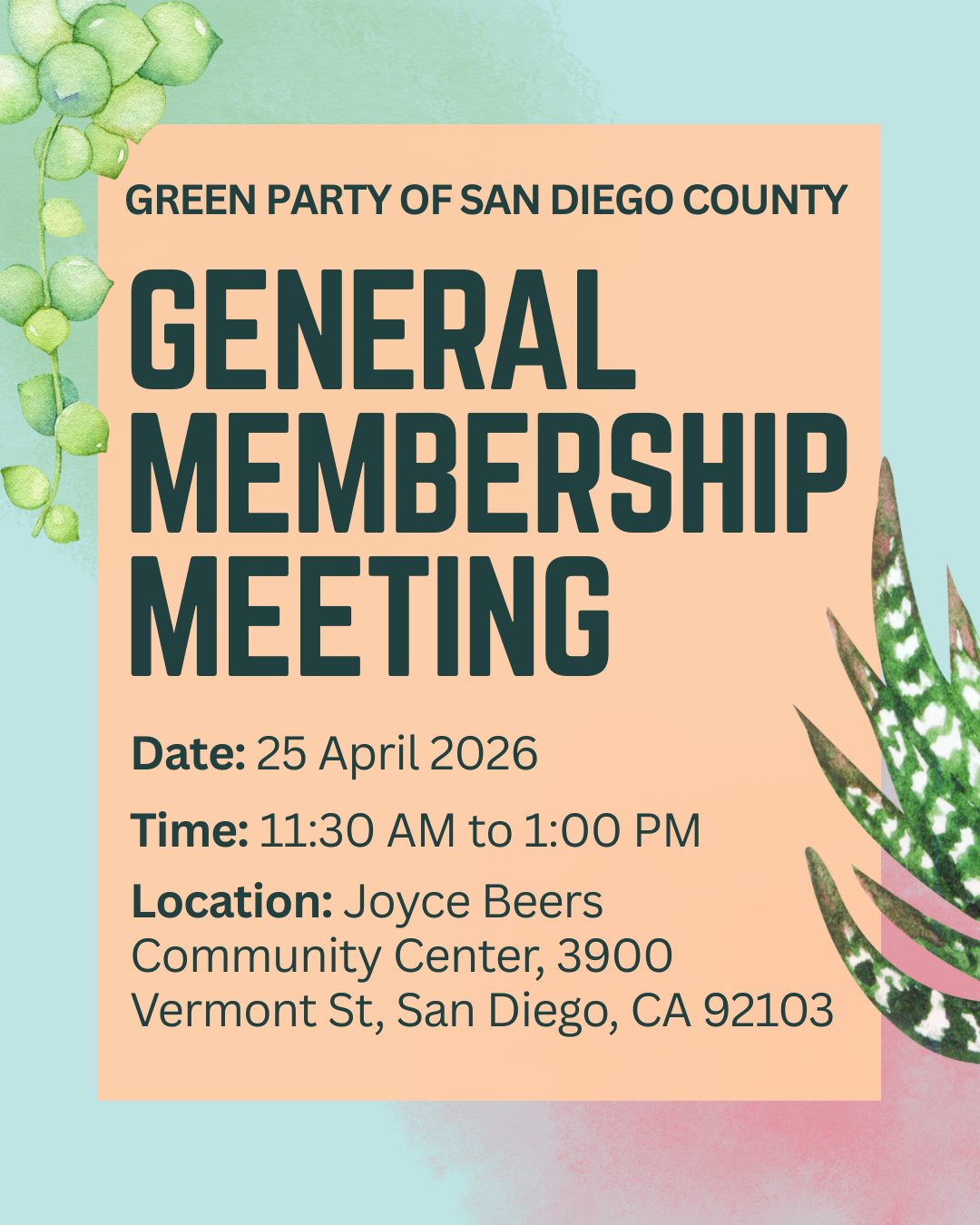 Join the San Diego Green Party for our monthly general membership meeting on Saturday, April 25, 11:30 AM to 1:00 PM. This meeting will be in person at the Joyce Beers Community Center, 3900 Vermont St, San Diego, CA 92103.