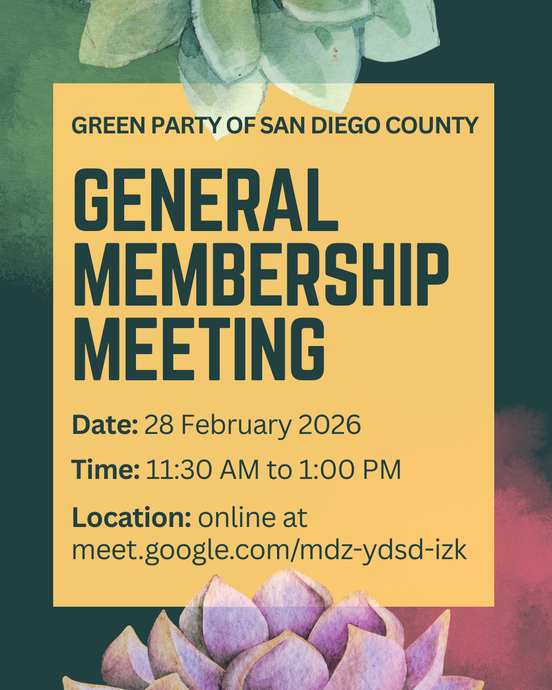 Join the San Diego Green Party for our monthly general membership meeting on Saturday, February 28, 11:30 AM to 1:00 PM. This meeting will be online (meet.google.com/mdz-ydsd-izk). Everyone is welcome!