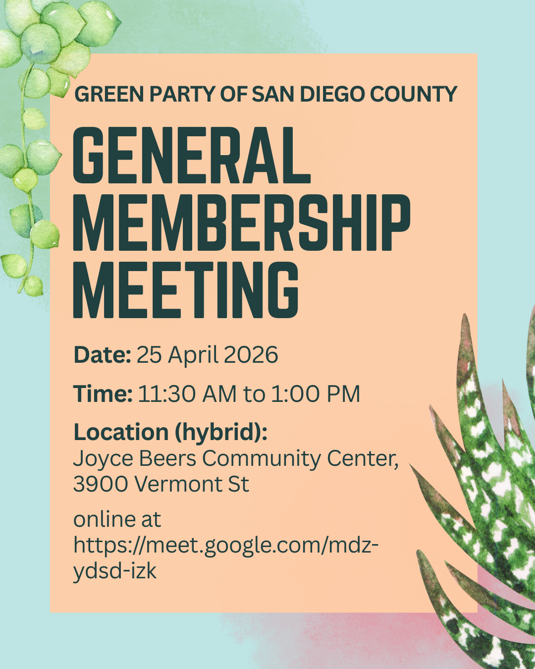 Join the San Diego Green Party for our monthly general membership meeting on Saturday, April 25, 11:30 AM to 1:00 PM. This meeting will be hybrid: in person at the Joyce Beers Community Center, 3900 Vermont St, San Diego, CA 92103, and online at https://meet.google.com/mdz-ydsd-izk.